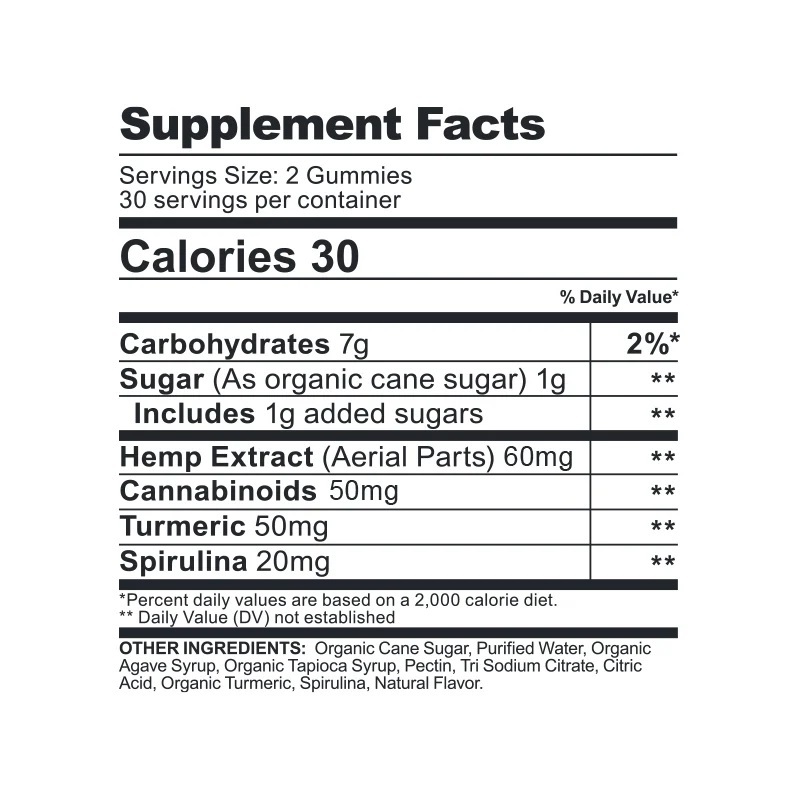 Enjoy the health-boosting one-two punch of “superfoods” Turmeric and Spirulina in this agave-sweetened CBD gummy with beneficial antioxidant and anti-inflammatory properties.