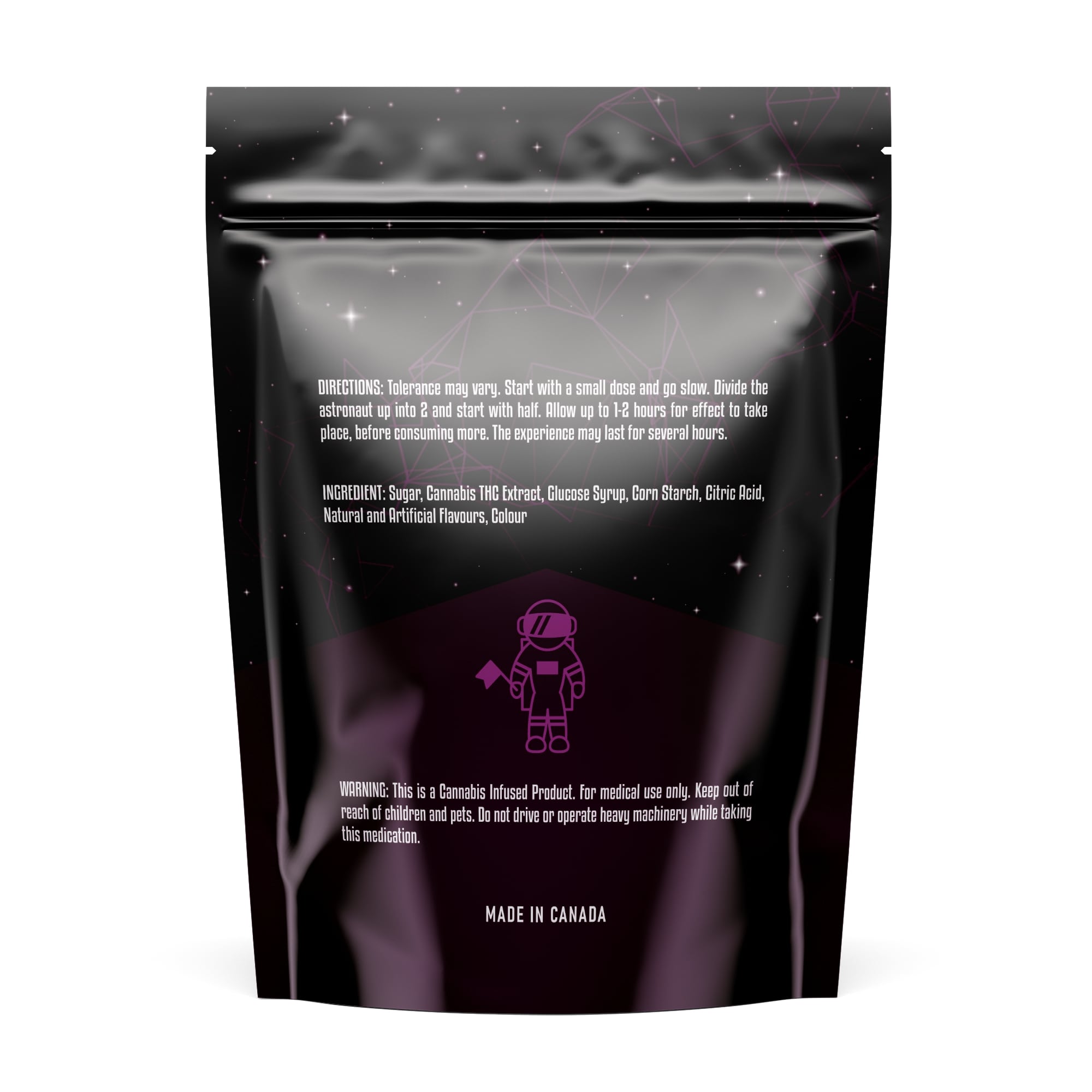 DOSAGE | Each piece contains 60mg of THC. Start with 1/2 of an Astro and allow 60-90 minutes for full effects to kick in. |