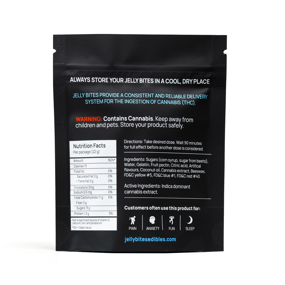 Unwind with the sweet, fruity flavors of Twisted Extracts Indica Regular Strength Jelly Bites (Berry Mix) – the perfect treat for a relaxing and soothing cannabis experience.